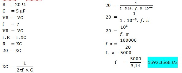 6. Sebuah Resistor 20 Ω disusun seri dengan sebuah kapasitor. Rangkaian dihubungkan ke sebuah tegangan sumber yang frekuensinya dapat berubah-ubah. Jika tegangan antara ujung-ujung resistor sama dengan tegangan antara ujung-ujung kapasitor , tentukanlah frekuensi sumber AC tersebut!